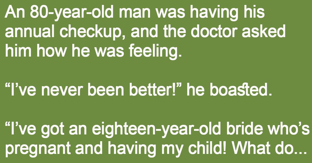 An 80-year-old man was having his annual checkup, and the doctor asked him how he was feeling. “I’ve never been better!” he boasted. “I’ve got an eighteen-year-old bride who’s … …