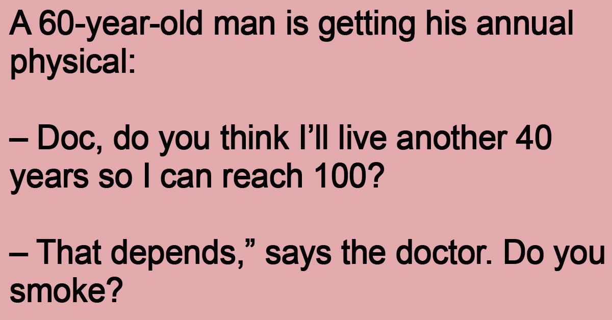 A 60-year-old man is getting his annual physical: – Doc, do you think I’ll live another 40 years so I can reach 100? – That depends,” says the doctor. … …