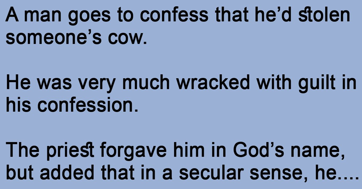 A man goes to confess that he’d stolen someone’s cow. He was very much wracked with guilt in his confession. The priest forgave him in God’s name, but added … …