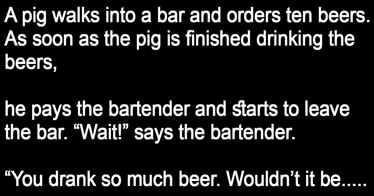 A pig walks into a bar and orders ten beers. As soon as the pig is finished drinking the beers, he pays the bartender and starts to leave the … …