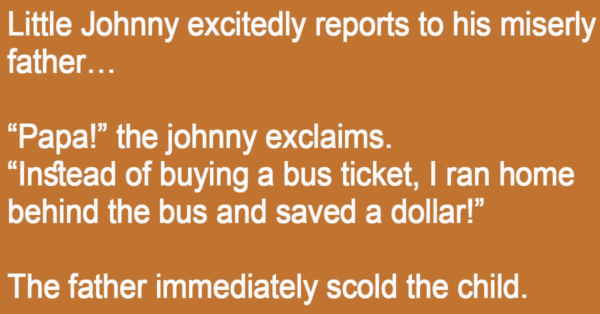 Little Johnny excitedly reports to his miserly father… “Papa!” the johnny exclaims. “Instead of buying a bus ticket, I ran home behind the bus and saved a dollar!” The … …