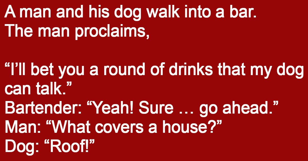 A man and his dog walk into a bar. The man proclaims, “I’ll bet you a round of drinks that my dog can talk.” Bartender: “Yeah! Sure … go … …