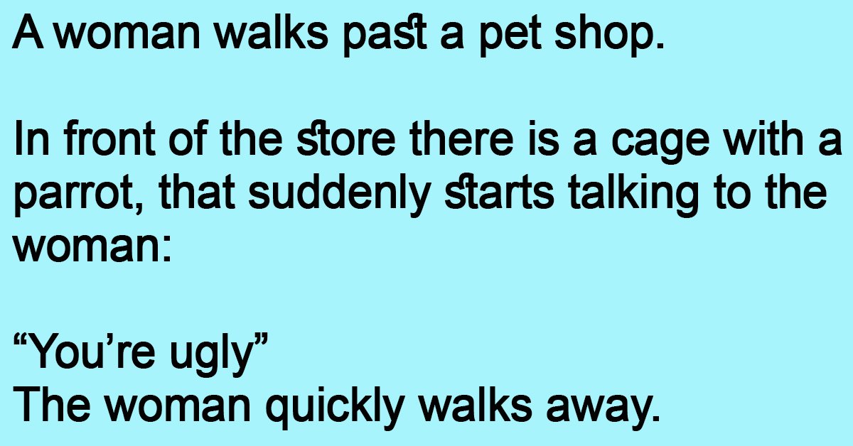A woman walks past a pet shop. In front of the store there is a cage with a parrot, that suddenly starts talking to the woman: “You’re ugly” The … …