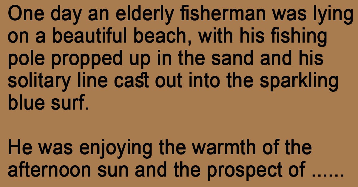 One day an elderly fisherman was lying on a beautiful beach, with his fishing pole propped up in the sand and his solitary line cast out into the sparkling blue … …