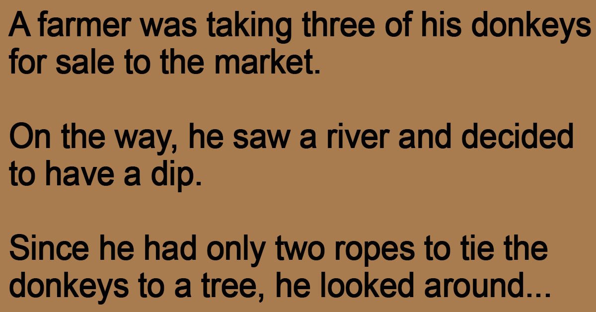 A farmer was taking three of his donkeys for sale to the market. On the way, he saw a river and decided to have a dip. Since he had only … …