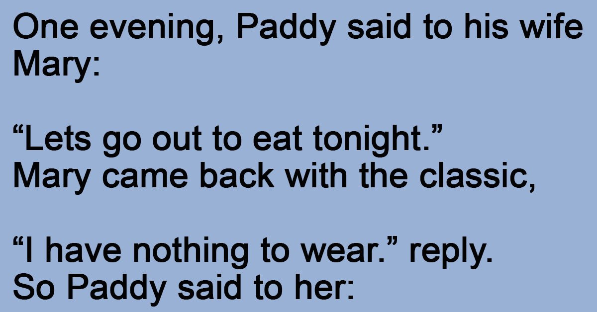One evening, Paddy said to his wife Mary: “Lets go out to eat tonight.” Mary came back with the classic, “I have nothing to wear.” reply. So Paddy said to … …