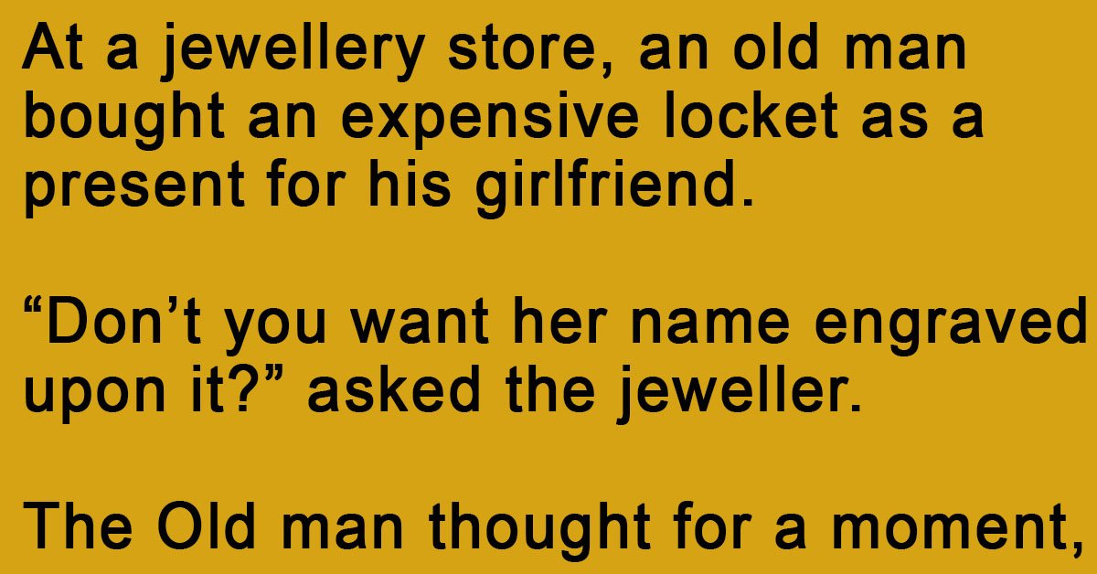 At a jewellery store, an old man bought an expensive locket as a present for his girlfriend. “Don’t you want her name engraved upon it?” asked the jeweller. The Old … …