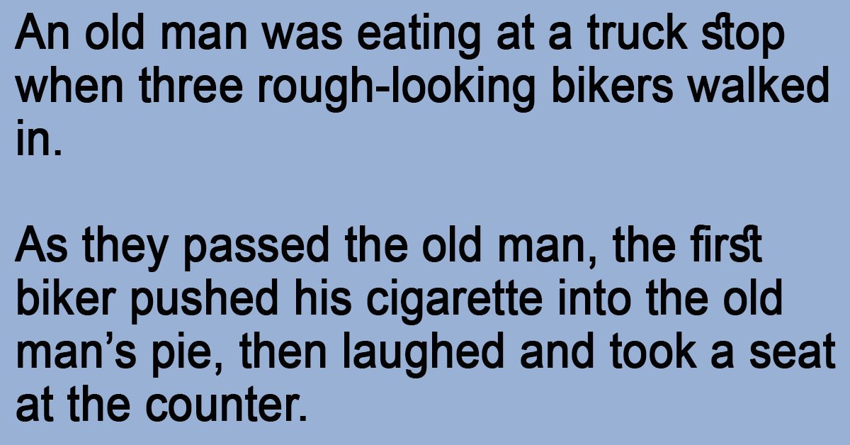 An old man was eating at a truck stop when three rough-looking bikers walked in. As they passed the old man, the first biker pushed his cigarette into the old … …