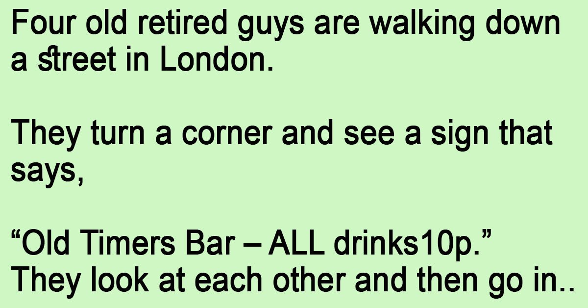 Four old retired guys are walking down a street in London. They turn a corner and see a sign that says, “Old Timers Bar – ALL drinks10p.” They look at … …