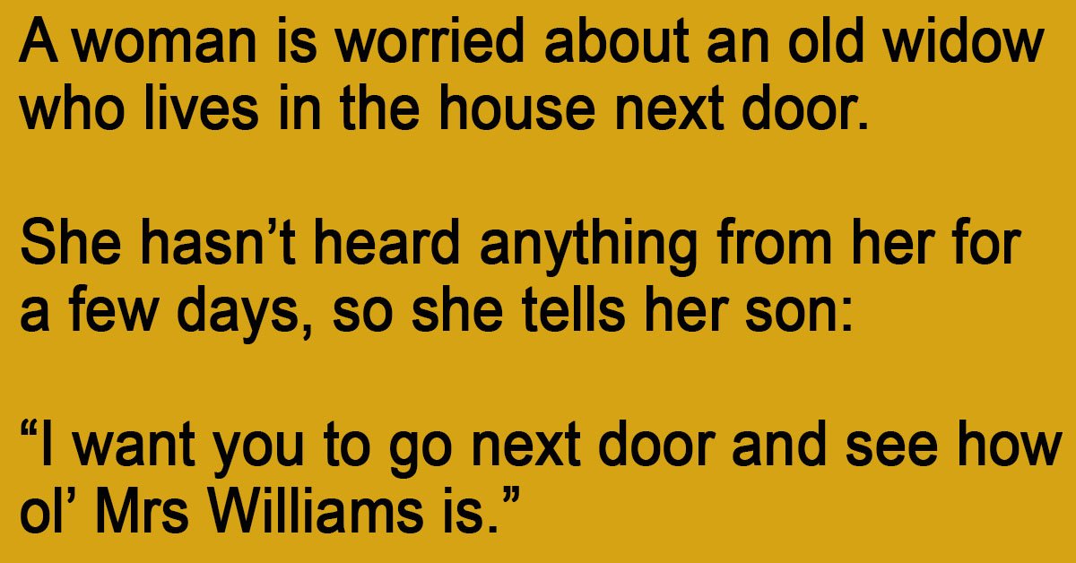 A woman is worried about an old widow who lives in the house next door. She hasn’t heard anything from her for a few days, so she tells her son: … …