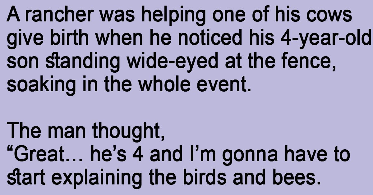 A rancher was helping one of his cows give birth when he noticed his 4-year-old son standing wide-eyed at the fence, soaking in the whole event. The man thought, “Great… … …
