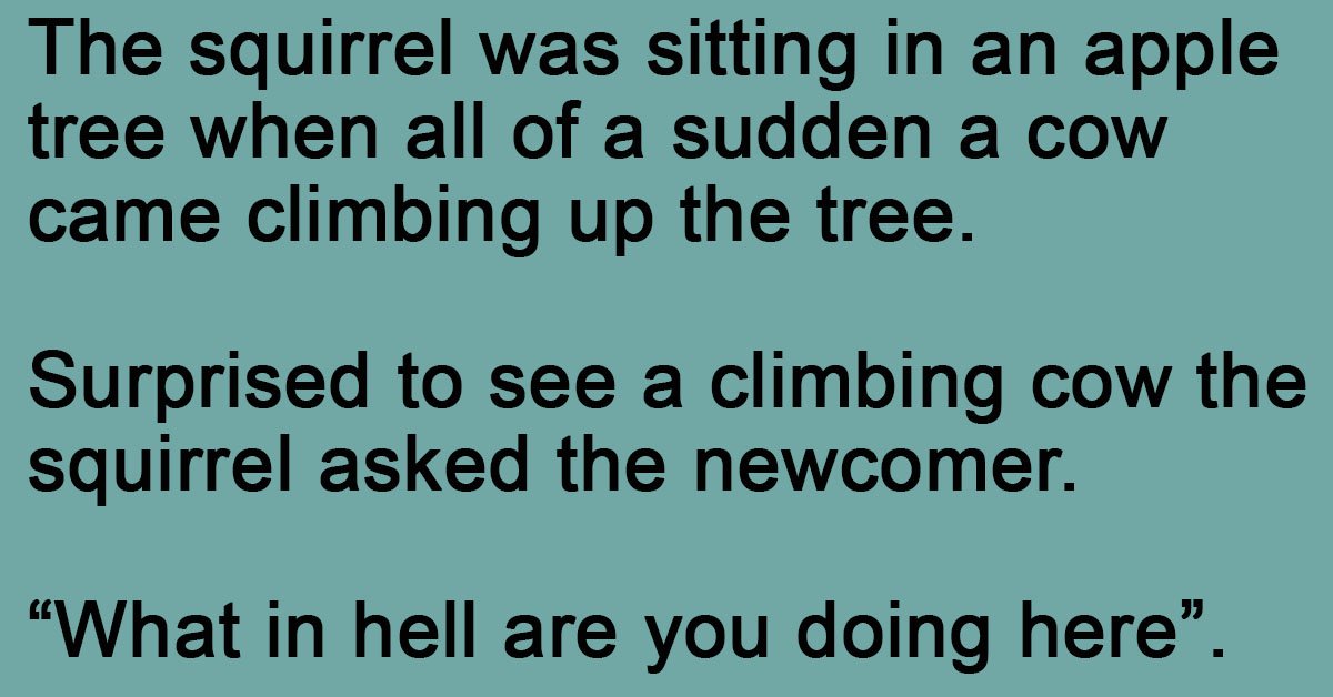 The squirrel was sitting in an apple tree when all of a sudden a cow came climbing up the tree. Surprised to see a climbing cow the squirrel asked the … …