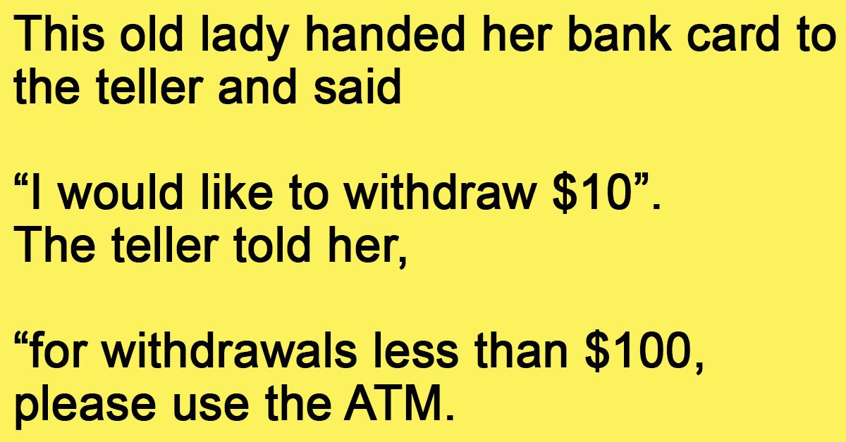 This old lady handed her bank card to the teller and said “I would like to withdraw $10”. The teller told her “for withdrawals less than $100, please use the … …