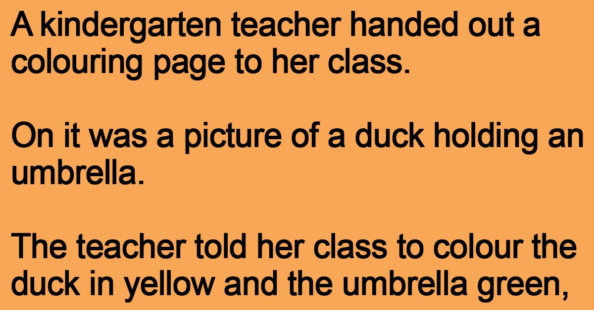 A kindergarten teacher handed out a colouring page to her class. On it was a picture of a duck holding an umbrella. The teacher told her class to colour the … …