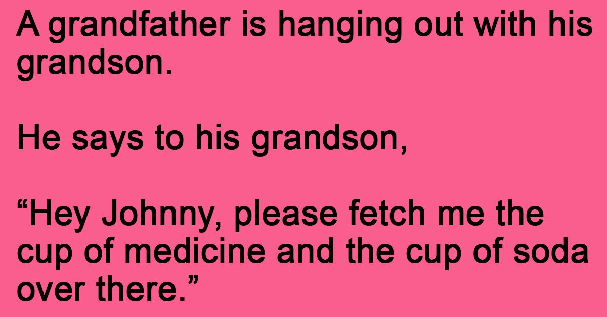 A grandfather is hanging out with his grandson. He says to his grandson, “Hey Johnny, please fetch me the cup of medicine and the cup of soda over there.” Grandson … …