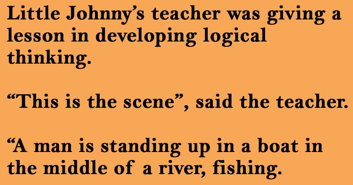 Little Johnny’s teacher was giving a lesson in developing logical thinking. “This is the scene”, said the teacher. “A man is standing up in a boat in the middle of … …