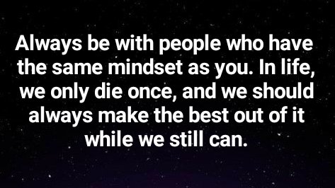 Always be with people who have the same mindset as you. In life, we only die once, and we should always make the best out of it while we still … …