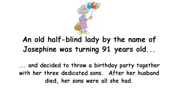 An old half-blind lady by the name of Josephine was turning 91 years old….. and decided to throw a birthday party together with her three dedicated sons. After her husband … …
