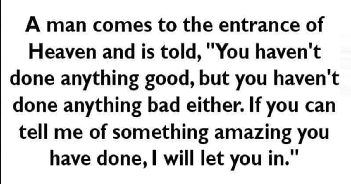 A man comes to the entrance of Heaven and he is told, “You haven’t done anything good, but you haven’t done anything bad either. If you can tell me of … …