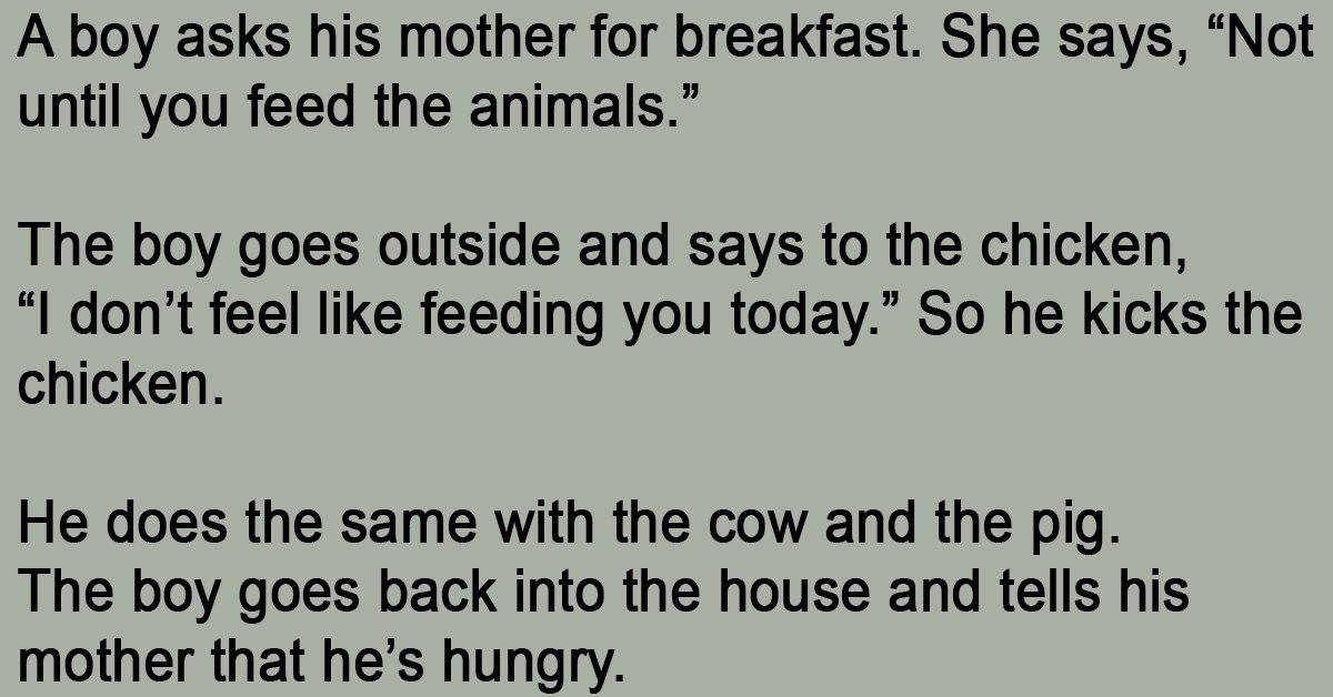 A boy asks his mother for breakfast. She says, “Not until you feed the animals.” The boy goes outside and says to the chicken, “I don’t feel like feeding you … …