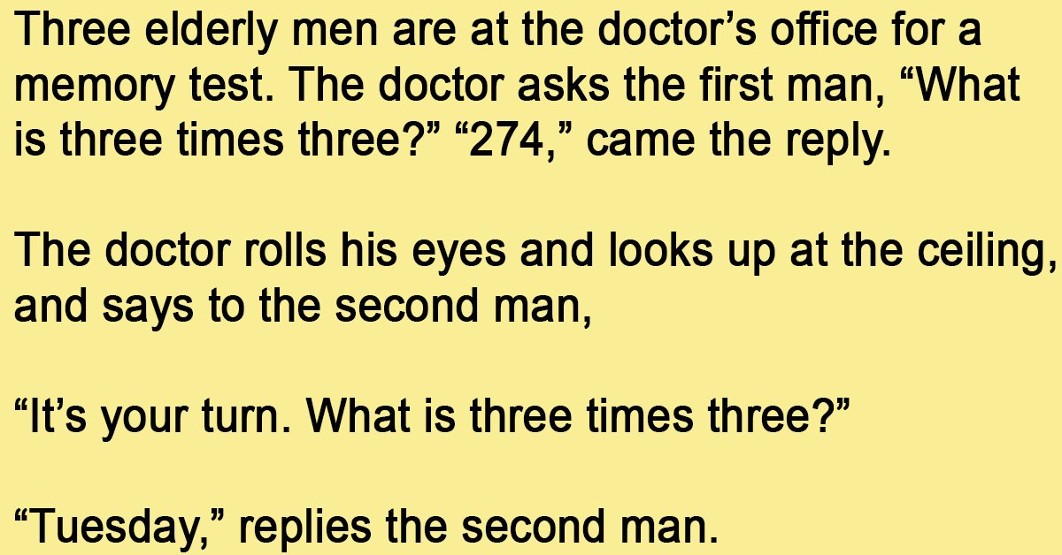 Three elderly men are at the doctor’s office for a memory test. The doctor asks the first man, “What is three times three?” “274,” came the reply. The doctor rolls … …