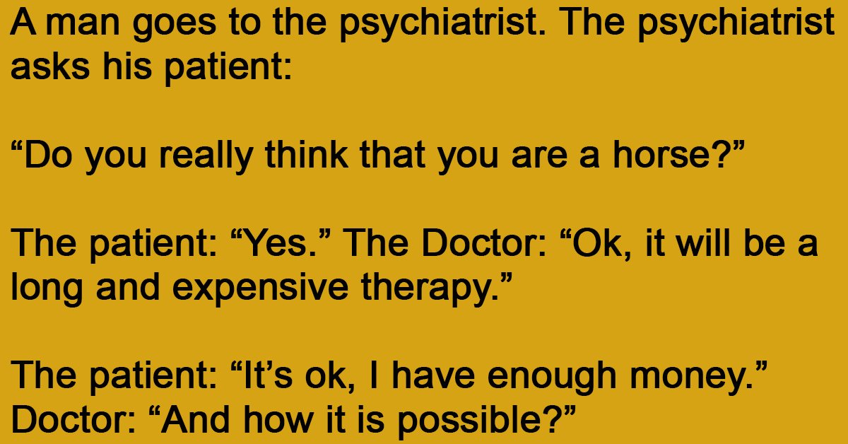 A man goes to the psychiatrist. The psychiatrist asks his patient: “Do you really think that you are a horse?” The patient: “Yes.” The Doctor: “Ok, it will be a long … …