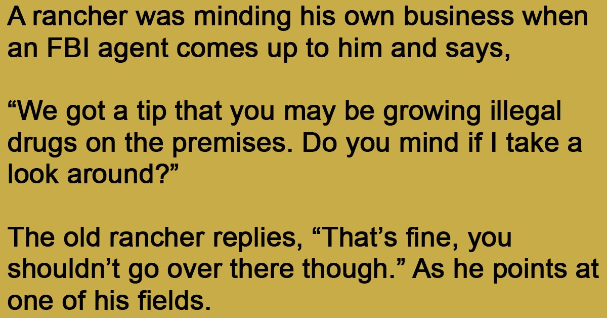 A rancher was minding his own business when an FBI agent comes up to him and says, “We got a tip that you may be growing illegal drugs on the premises. Do … …