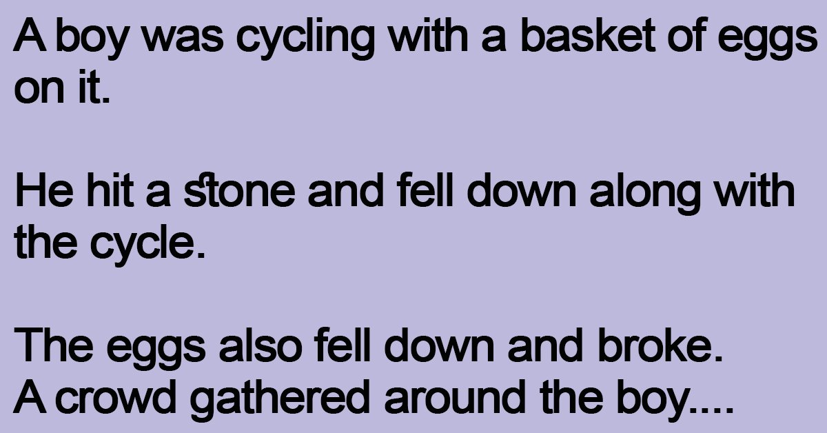 A boy was cycling with a basket of eggs on it. He hit a stone and fell down along with the cycle. The eggs also fell down and broke. … …