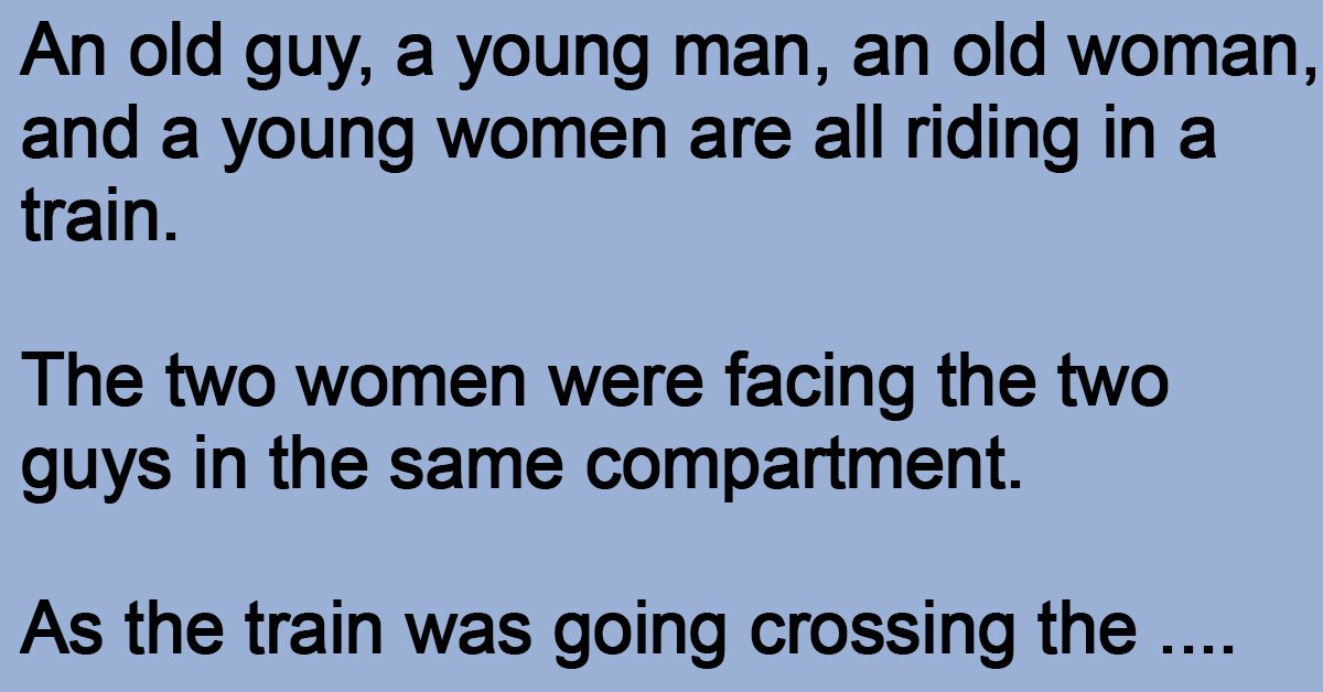 An old guy, a young man, an old woman, and a young women are all riding in a train. The two women were facing the two guys in the … …