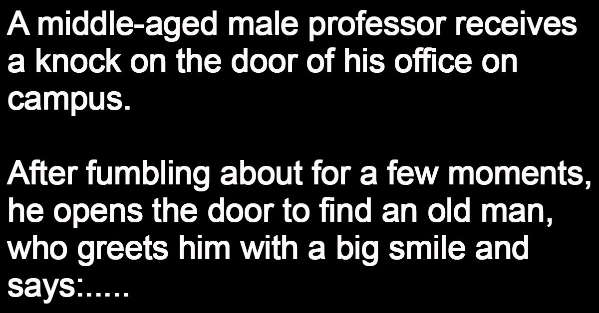 A middle-aged male professor receives a knock on the door of his office on campus. After fumbling about for a few moments, he opens the door to find an … …