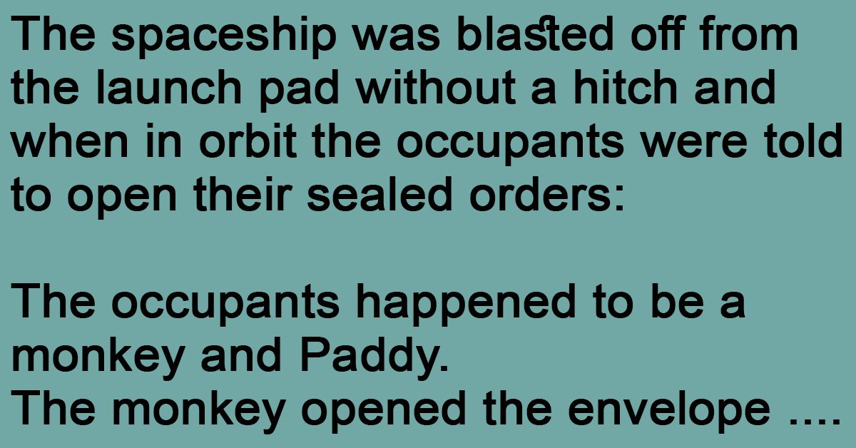 The spaceship was blasted off from the launch pad without a hitch and when in orbit the occupants were told to open their sealed orders: The occupants happened to … …