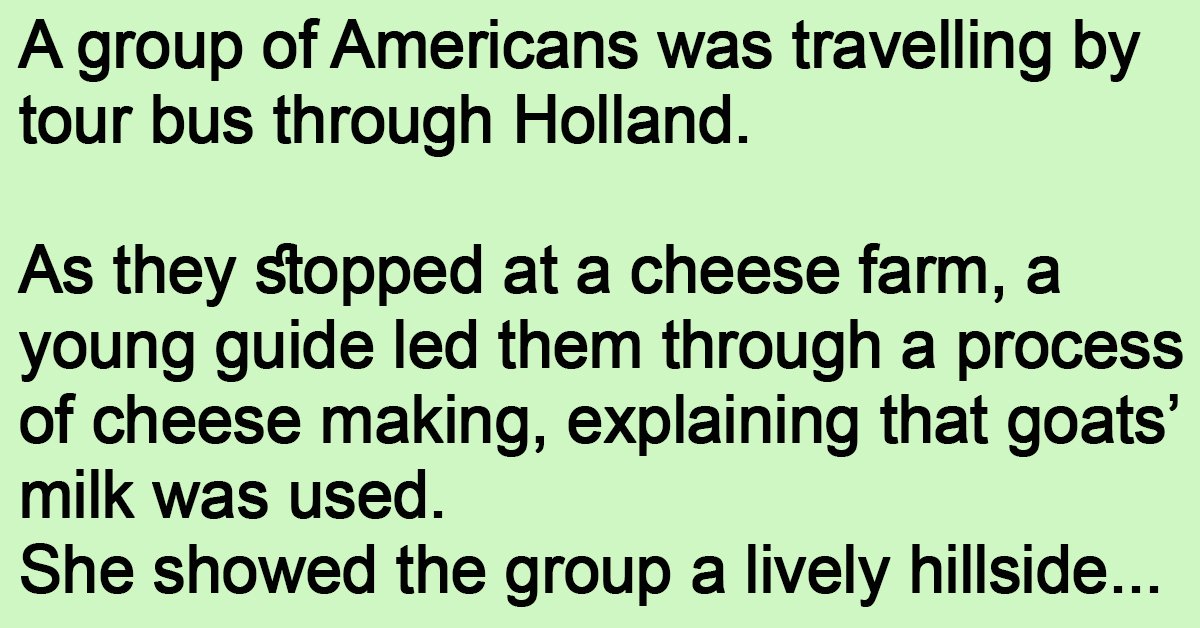 A group of Americans was travelling by tour bus through Holland. As they stopped at a cheese farm, a young guide led them through a process of cheese making, … …
