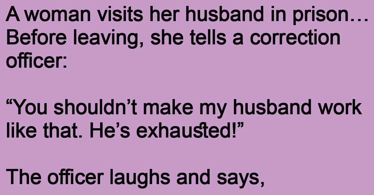 A woman visits her husband in prison… Before leaving, she tells a correction officer: “You shouldn’t make my husband work like that. He’s exhausted!” The officer laughs and says, … …