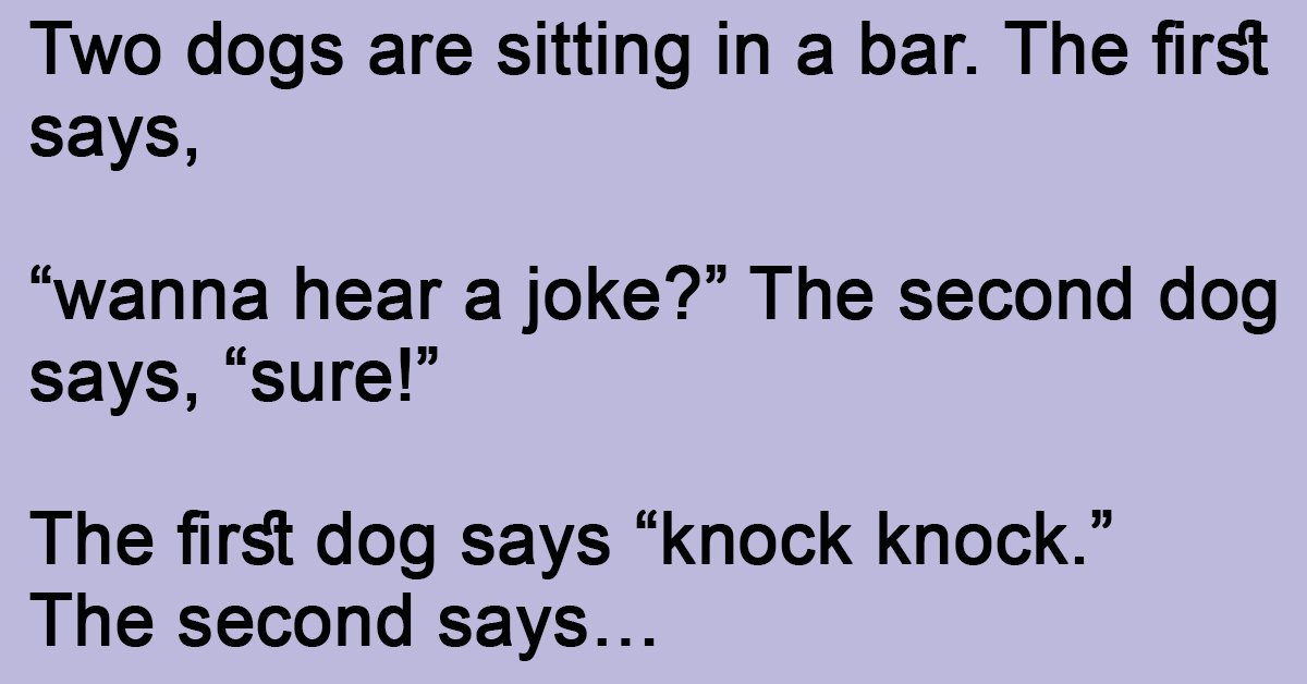 Two dogs are sitting in a bar. The first says, “wanna hear a joke?” The second dog says “sure!” The first dog says “knock knock.” The second says… WOOF … …