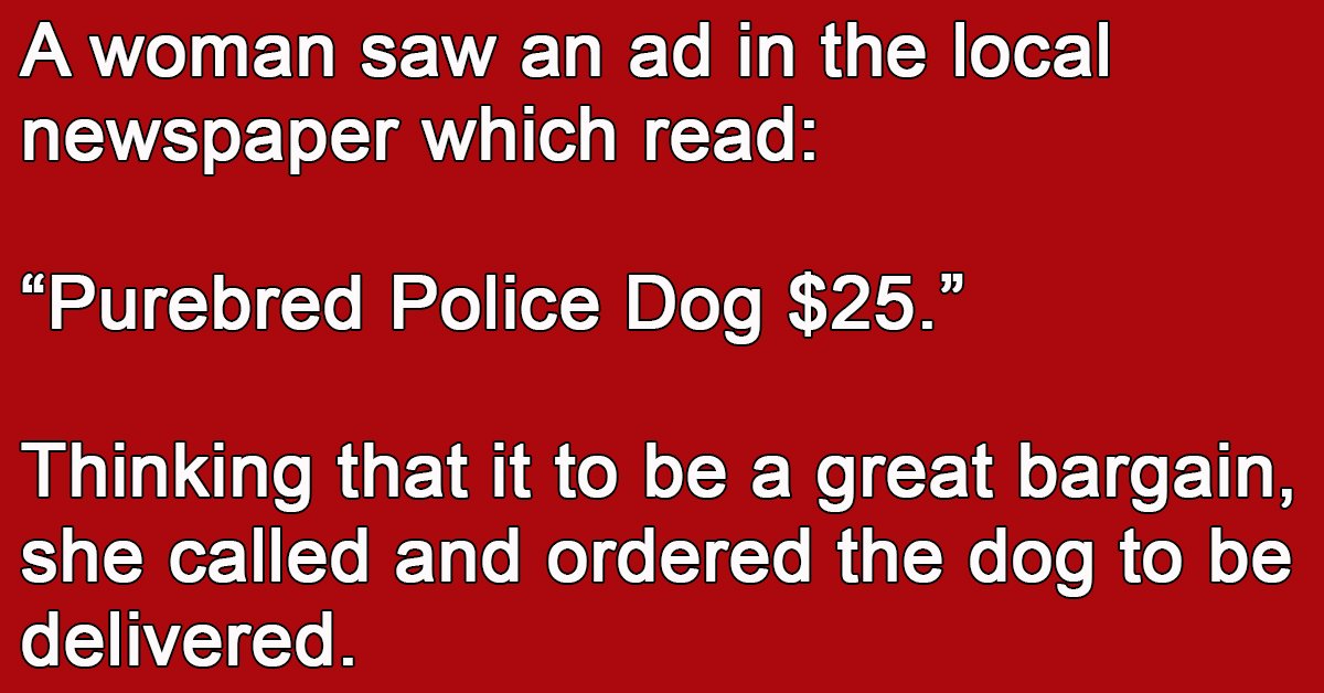 A woman saw an ad in the local newspaper which read: “Purebred Police Dog $25.” Thinking that it to be a great bargain, she called and ordered the dog … …
