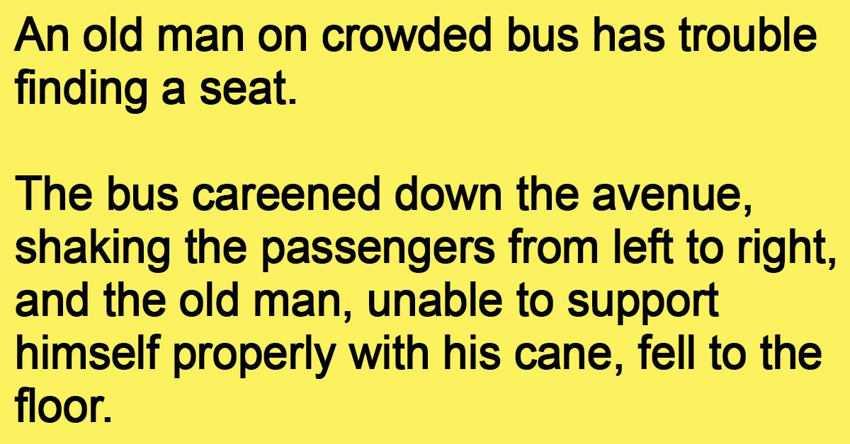 An old man on crowded bus has trouble finding a seat. The bus careened down the avenue, shaking the passengers from left to right, and the old man, unable … …
