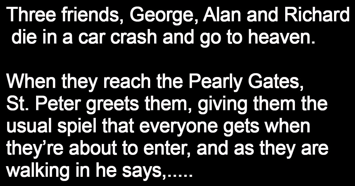 Three friends, George, Alan and Richard, die in a car crash and go to heaven. When they reach the Pearly Gates, St. Peter greets them, giving them the usual … …