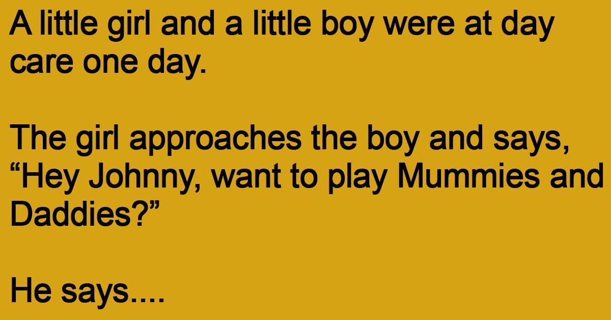 A little girl and a little boy were at day care one day. The girl approaches the boy and says, “Hey Johnny, want to play Mummies and Daddies?” He … …