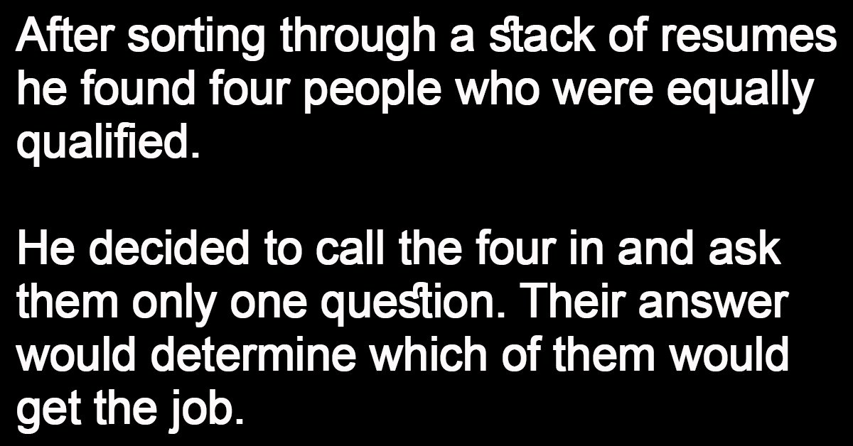 A manager at Wal-Mart had the task of hiring someone to fill a job opening. After sorting through a stack of resumes he found four people who were … …