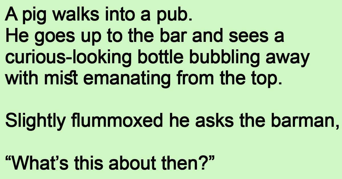 A pig walks into a pub. He goes up to the bar and sees a curious-looking bottle bubbling away with mist emanating from the top. Slightly flummoxed he asks … …