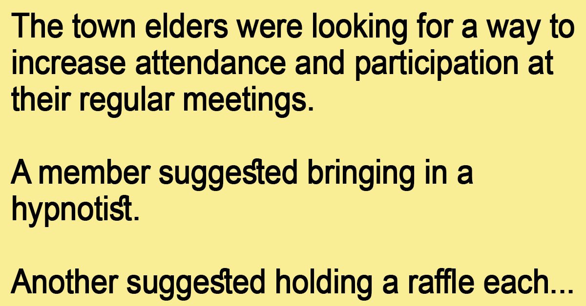 The town elders were looking for a way to increase attendance and participation at their regular meetings. A member suggested bringing in a hypnotist. Another suggested holding a raffle each … …
