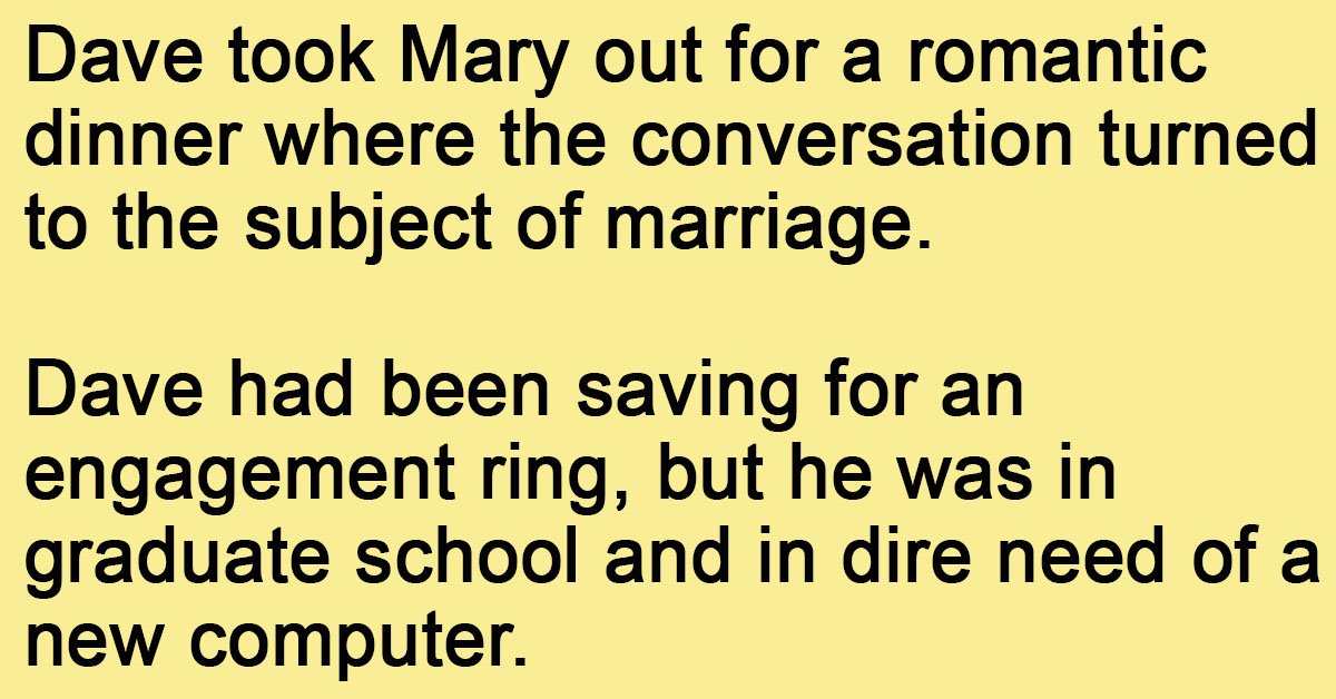 Dave took Mary out for a romantic dinner where the conversation turned to the subject of marriage. Dave had been saving for an engagement ring, but he was in graduate … …