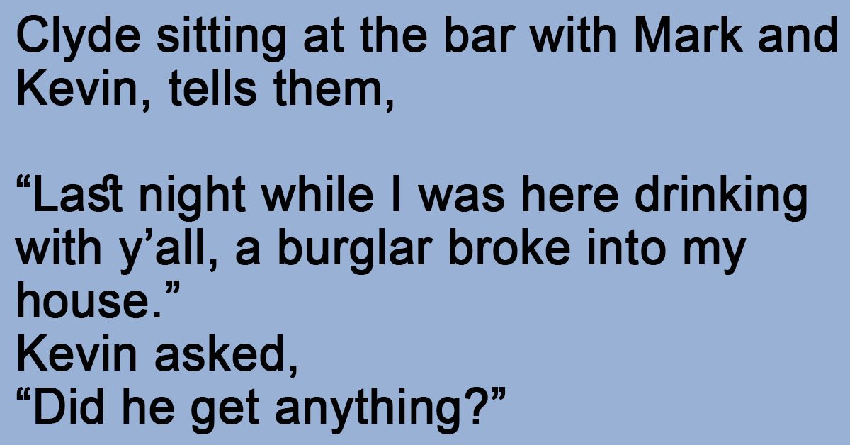 Clyde sitting at the bar with Mark and Kevin, tells them, “Last night while I was here drinking with y’all, a burglar broke into my house.” Kevin asked, “Did he … …