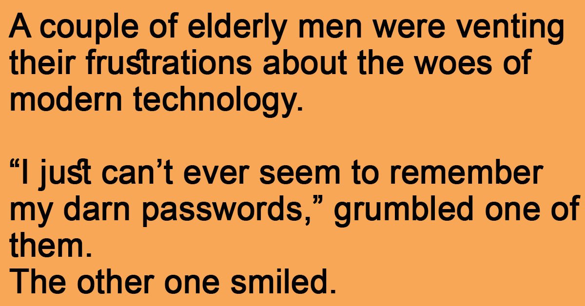 A couple of elderly men were venting their frustrations about the woes of modern technology. “I just can’t ever seem to remember my darn passwords,” grumbled one of them. The … …