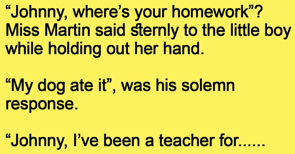 “Johnny, where’s your homework”? Miss Martin said sternly to the little boy while holding out her hand. “My dog ate it”, was his solemn response. “Johnny, I’ve been a teacher … …