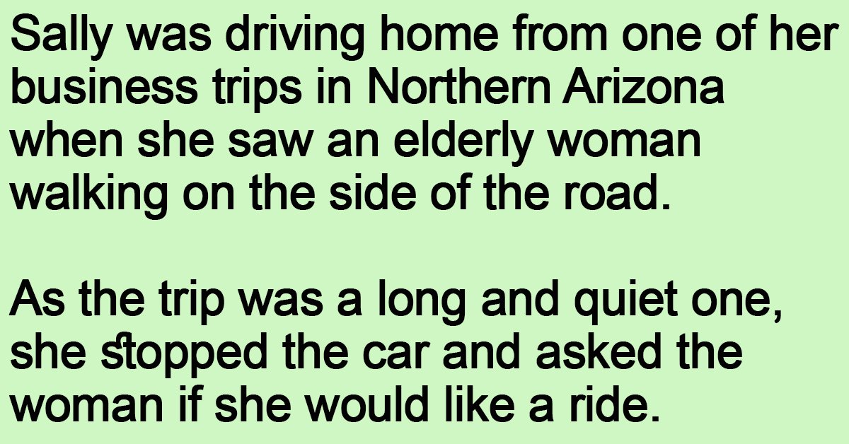 Sally was driving home from one of her business trips in Northern Arizona when she saw an elderly woman walking on the side of the road.