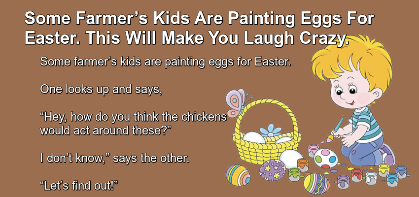 Some Farmer’s Kids Are Painting Eggs For Easter. – April 17, 2022 by Kevin Adams Facebook Twitter Pinterest LinkedIn Some farmer’s kids are painting eggs for Easter. One looks up and says, “Hey, how do you think the chickens would act around these?” I don’t know,” says the other. “Let’s find out!” They go into the chicken coop, steal the fresh eggs and replace them with the colourful eggs. The kids step out and watch. The hens come in and nothing, they go about their business. The rooster struts in sees the eggs and has a fit. He bursts out of the coop, storms across the farmyard, and beats the hell out of the peacock. Facebook Twitter Pinterest LinkedIn