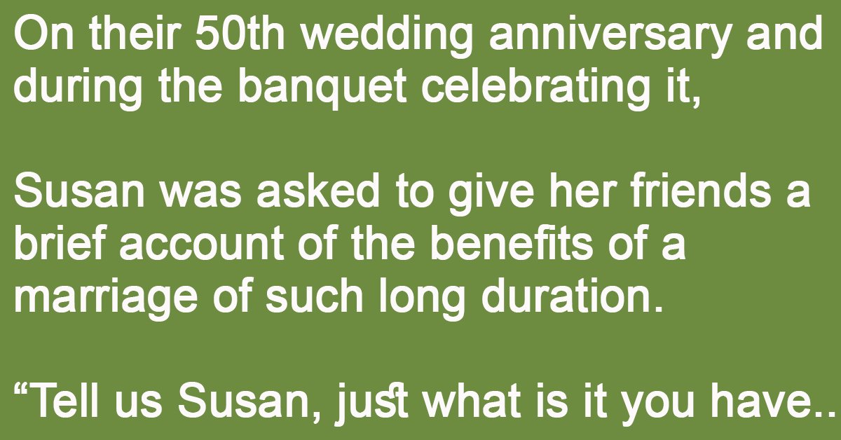 Susan was asked to give her friends a brief account of the benefits of a marriage of such long duration.