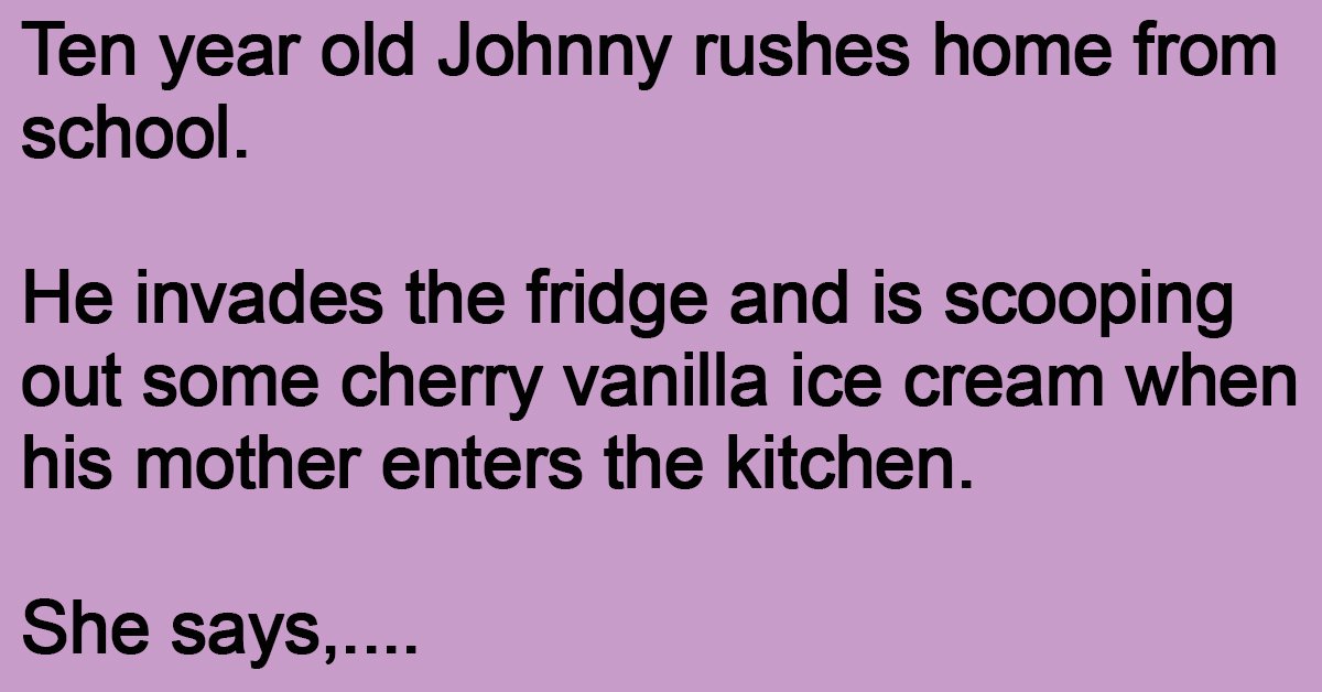 He invades the fridge and is scooping out some cherry vanilla ice cream when his mother enters the kitchen.