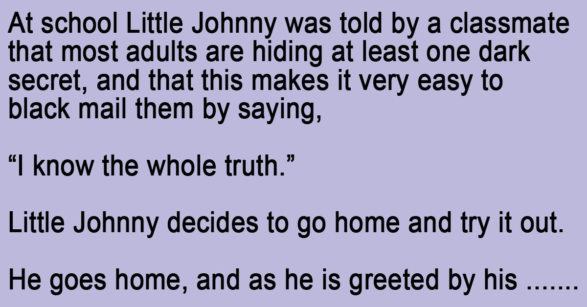 At school Little Johnny was told by a classmate that most adults are hiding at least one dark secret, and that this makes it very easy to blackmail them by saying, “I know the whole truth.”